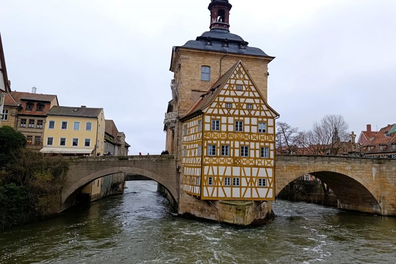 Questo è l’edificio che ricorda tantissimo l’Alsazia. L’Altes Rathaus non è famoso solo perché è bello, ma perché la sua posizione è già una dichiarazione: il municipio di Bamberga non si trova su una piazza o lungo una via principale, ma su un piccolo isolotto al centro del fiume Regnitz, collegato alle due sponde da due ponti. È una scelta insolita e, proprio per questo, è diventato il simbolo più riconoscibile della città.